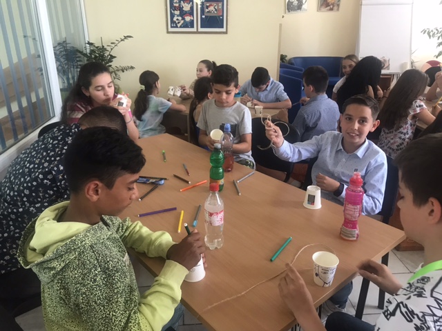 Témou bola kniha plecháč Bob. Žiaci si pomaľovali svojho "plecháča" z papierového pohárika a dvojica si ich spojila špagátom. Využili fyziku a vytvorili si "telefón". Žiaci si navzájom svoje "telefóny" prepojili aj v skupinách po štyroch alebo ôsmych a veľmi sa tešili, že im to fungovalo. Táto aktivita bola pre nich veľmi zaujímavá a podnetná.