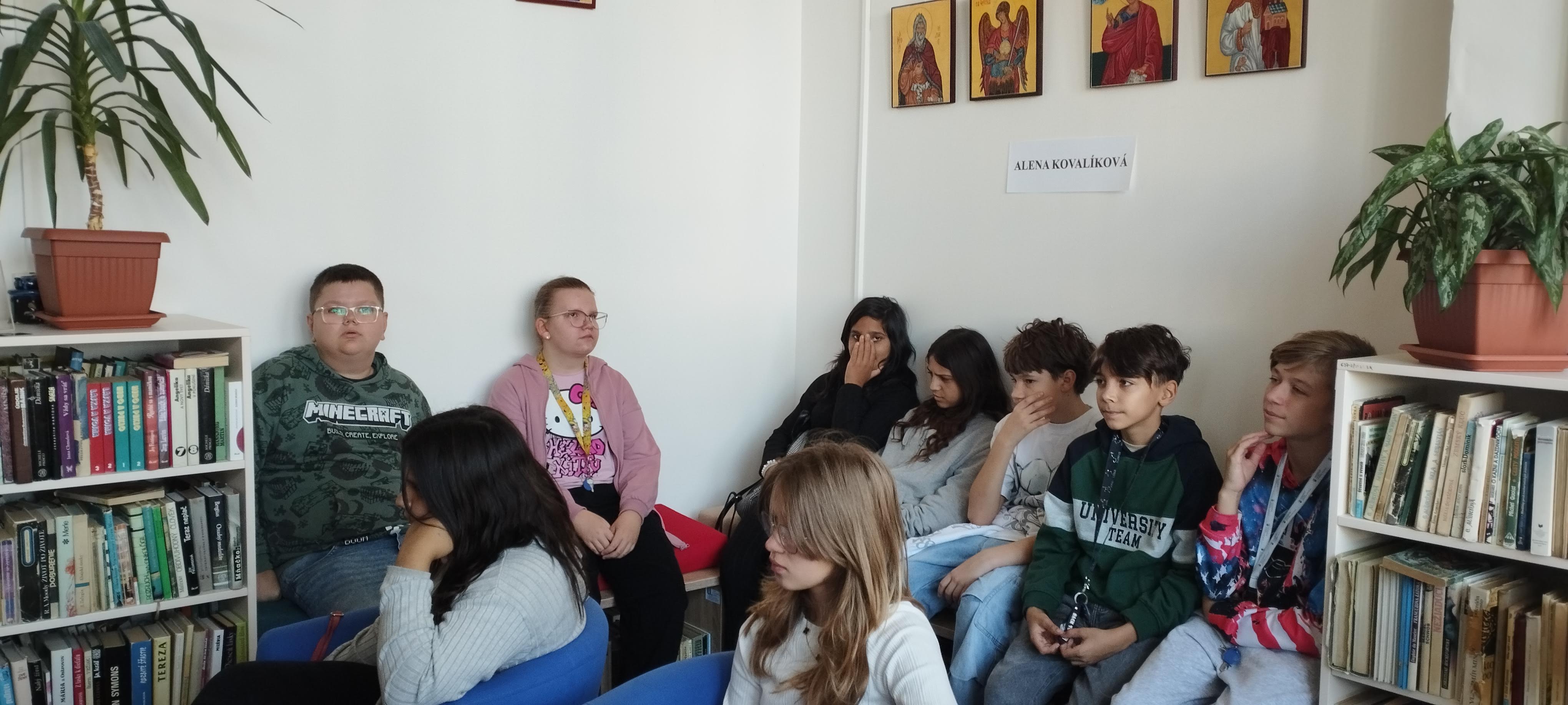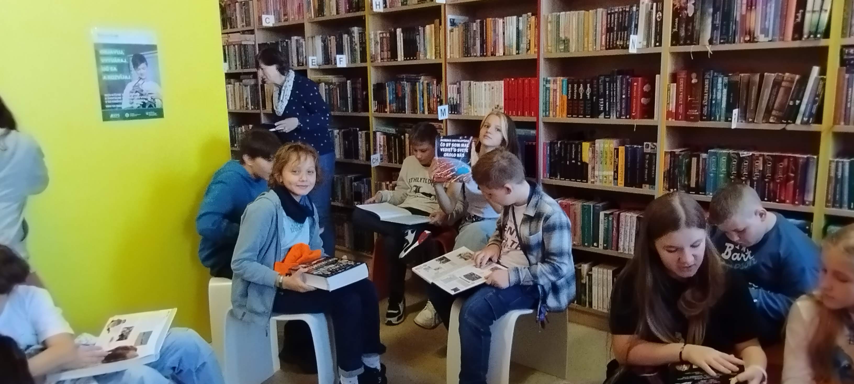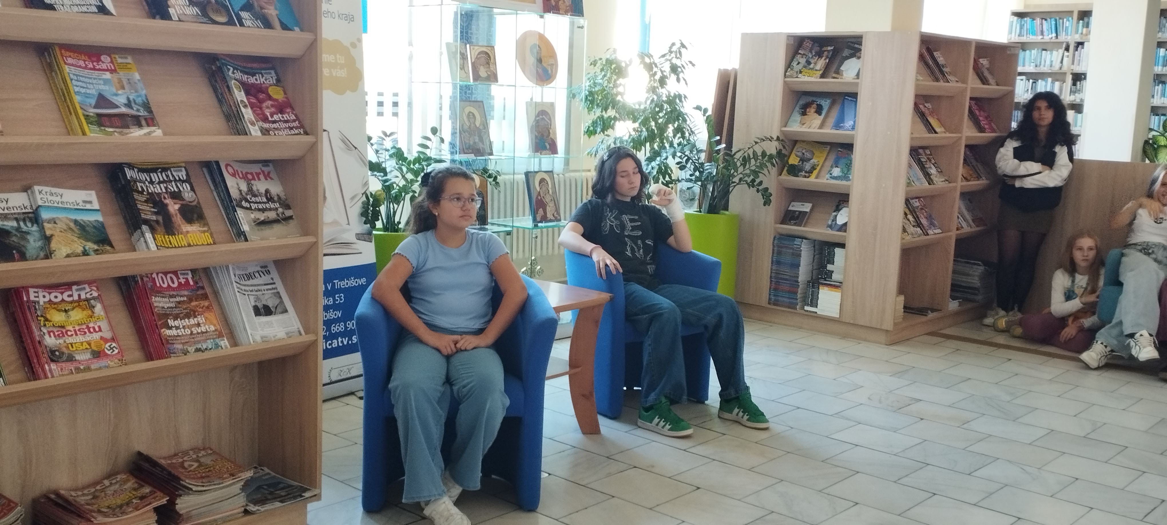 V knižnici nás už s úsmevom čakala pani knihovníčka, ktorá nás srdečne privítala. Na začiatku sme obdivovali výstavu nádherných ikon od rôznych umelcov Následne sme sa presunuli do oddelenia pre mládež, kde nám pani knihovníčka predstavila svet náučnej literatúry.
